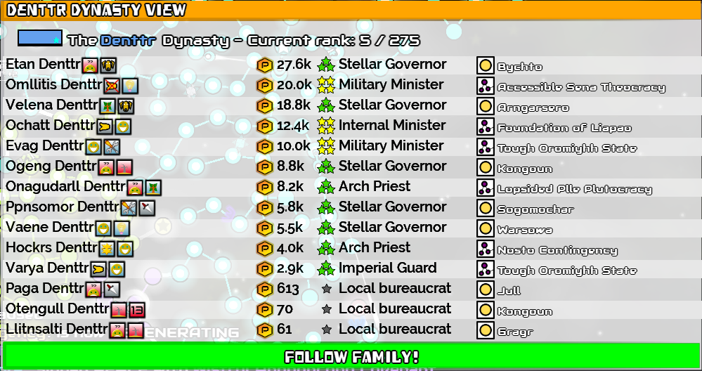 Each family also has a prestige level, which is built up over time by the prestige of the family members. If high prestige family members are lost, then over time the prestige level of that family will drop. From the family view, you can also see which prestige rank this family holds compared to other dynasties in the galaxy.